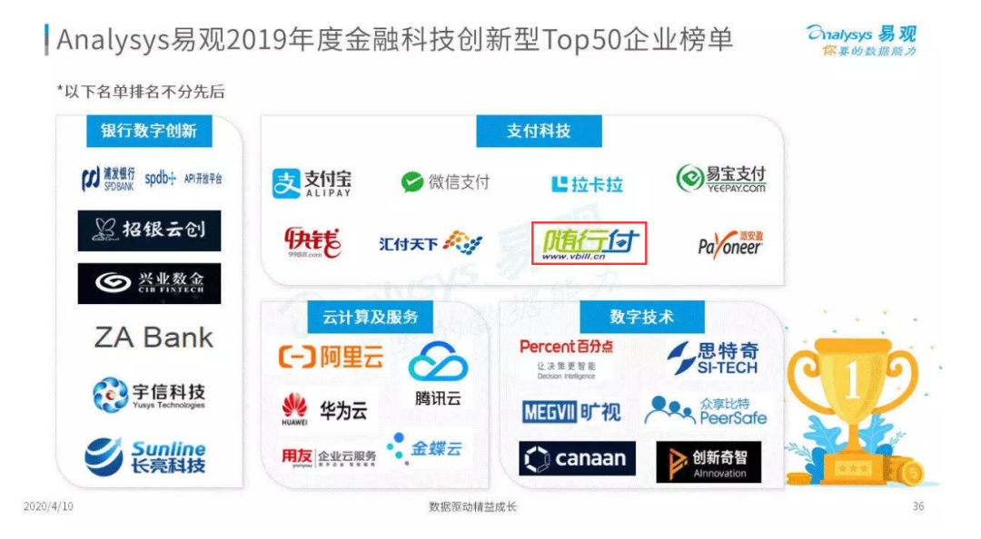 近日,易观首次发布了“2019年度金融科技创新型企业TOP50榜单”。该榜单涵盖了银行、支付、保险、证券、普惠金融等多个领域,其中包括支付宝、微信支付、随行付、汇付天下、拉卡拉等支付科技类企业榜上有名。